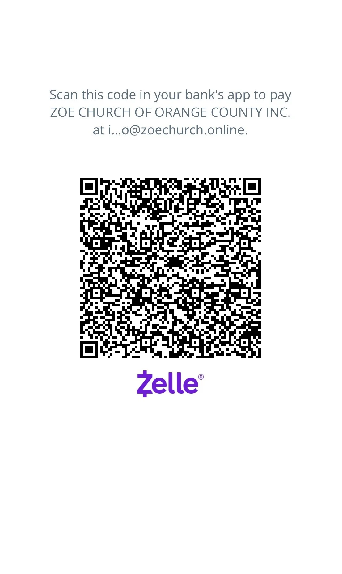 ZELLE at info@zoechurch.online or zoechurchoc@gmail.com
